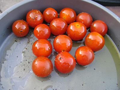 As you start the cooking phase place your cherry tomatoes in a small baking tray and pour over a lug of olive oil. Season with salt and pepper and place the tray over the coals to allow them gently to warm through.